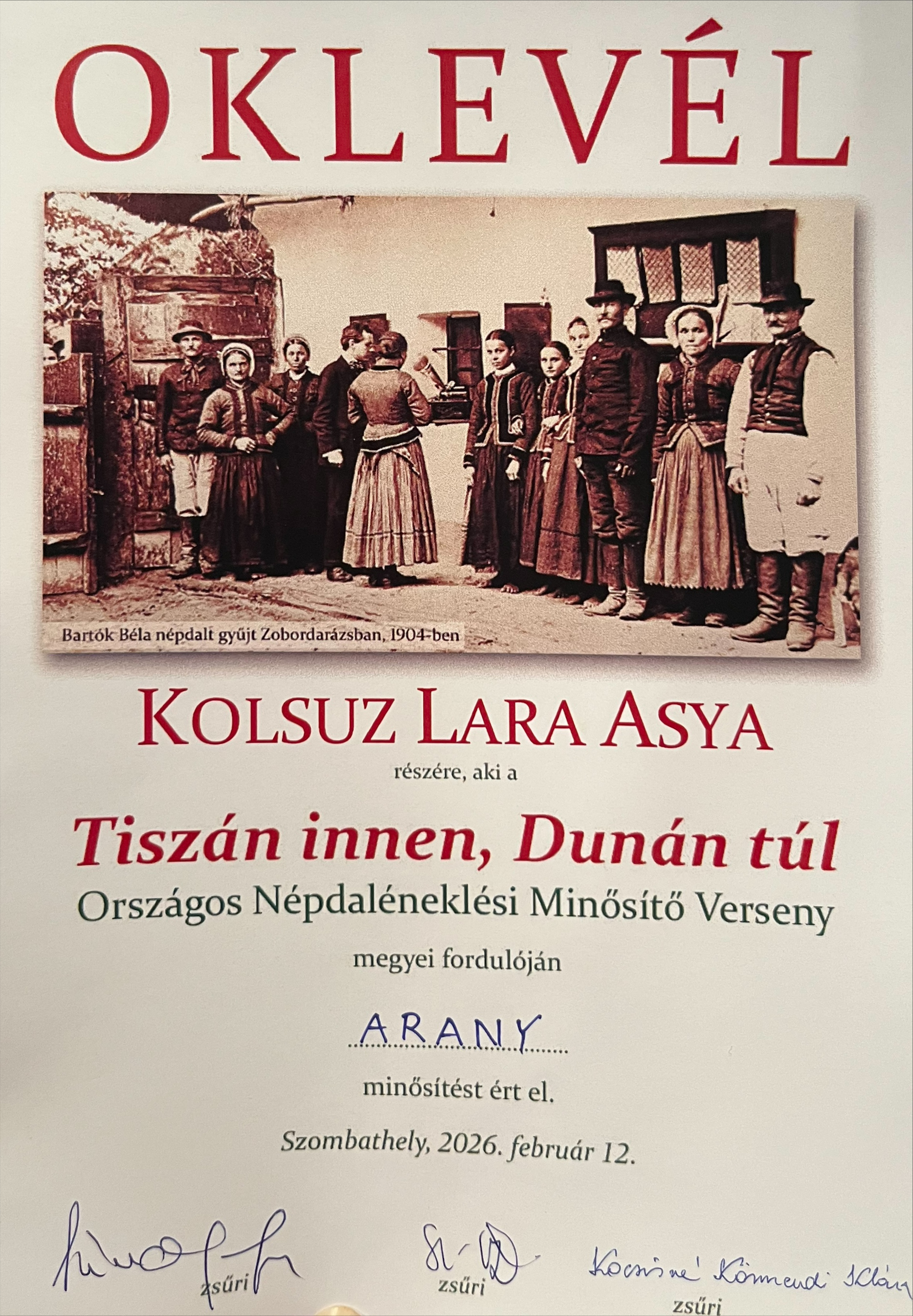 🎼Arany minősítést szerzett Kolsuz Lara Asya a “Tiszán innen, Dunán túl” elnevezésű országos népdaléneklési minősítő verseny megyei fordulóján, 5.,6. évfolyam szóló kategóriájában.